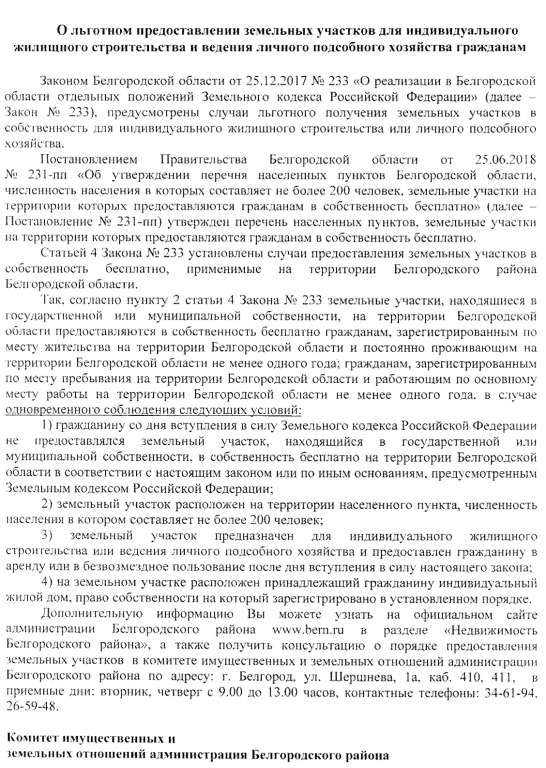 в Белгородской области отдельных положений Земельного кодекса Российской Федерации» (далее Закон № 233), предусмотрены случаи льготного получения земельных участков в собственность для индивидуального жилищного строительства или личного подсобного хозяйства.