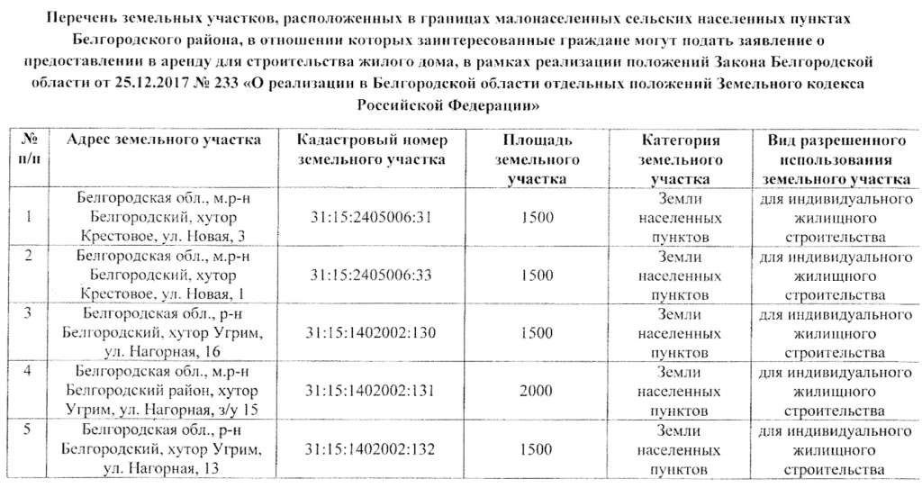 для индивидуального жилищного строительства и ведения личного подсобного хозяйства многодетным семьям, проживающим на территории Белгородского района, а также гражданам, проживающим на территории Белгородской области