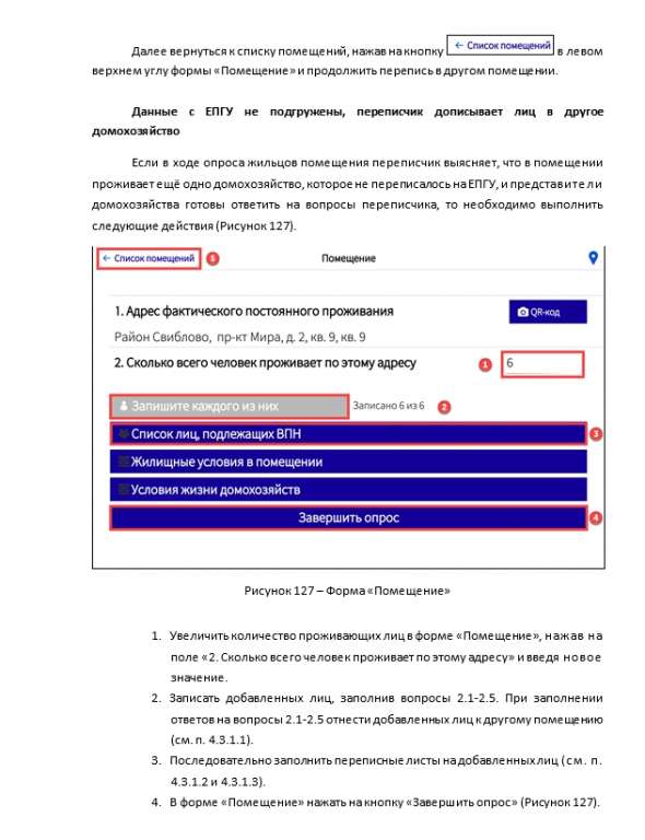 В примечании к данному помещению зафиксировать со слов респондента информацию о числе лиц в домохозяйстве, их поле и дате рождения (обязательно), записать цифровые КП (при наличии цифровых КП у респондента). Кроме того, если респондент на портале Госуслуг в вопросе 1 ЭПЛ указал не свой фактический адрес проживания, то надо также добавить в примечание запись «в вопросе 1 на ЕПГУ ошибка в адресе» и записать его.
