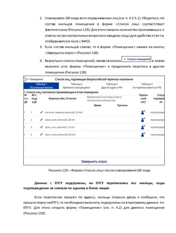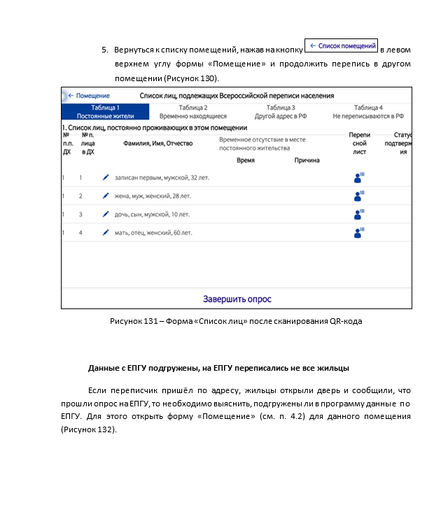 В этом случае нужно сохранить код, установить помещению статус «Ожидание КП», в примечании к помещению зафиксировать со слов респондента информацию о числе лиц в домохозяйстве, их поле и дате рождения. Сохраненный код в папке «EpguNewAddress» на SD-карте передать внесистемным способом через контролера ПУ в ТОГС.