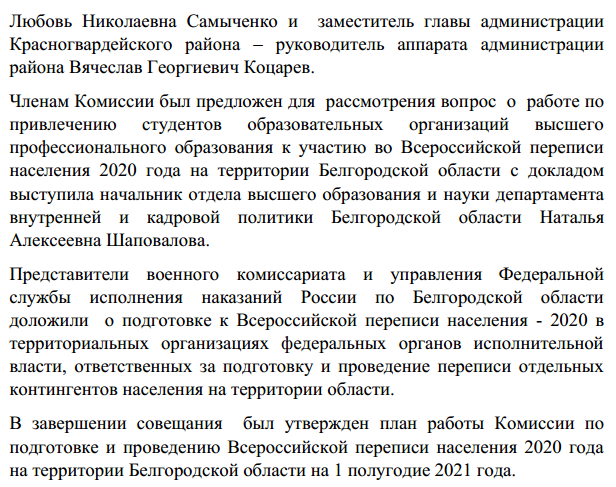 По итогам работы регистраторов планируется проведение заседания Комиссии по подготовке и проведению Всероссийской переписи населения 2020 года на территории Белгородского района.